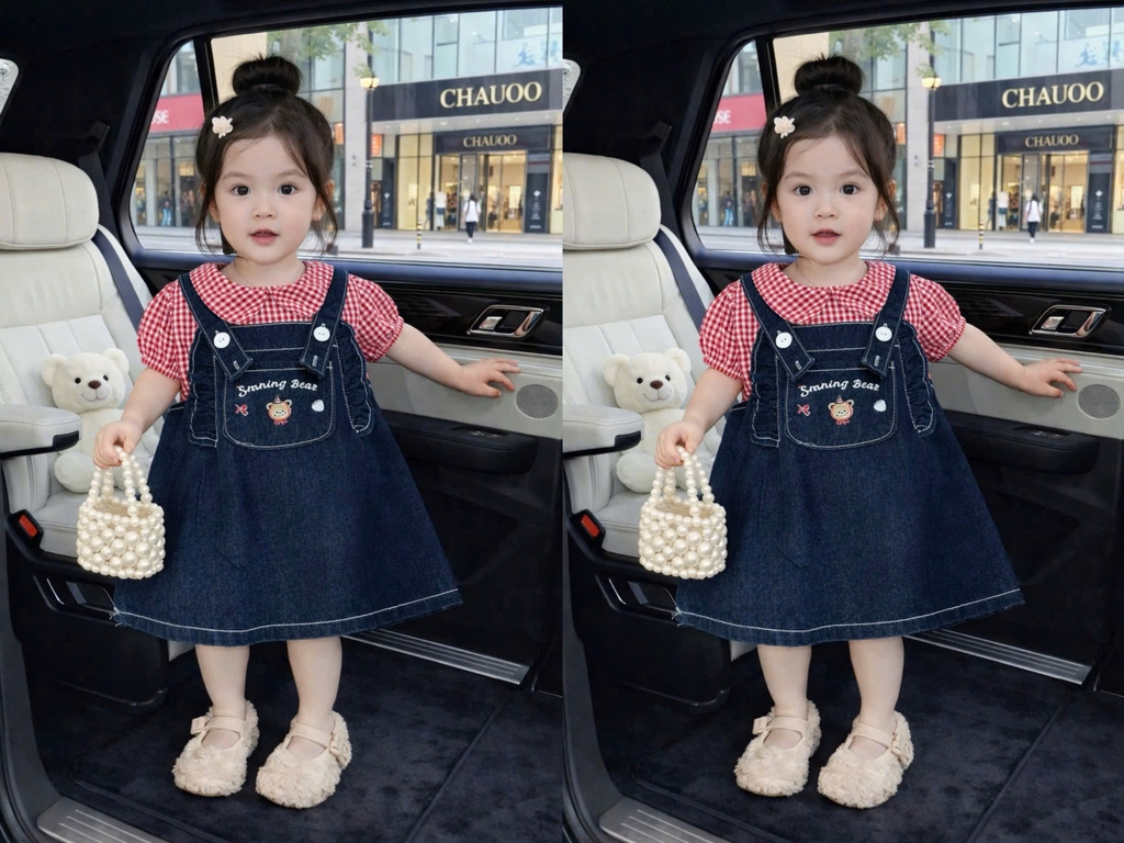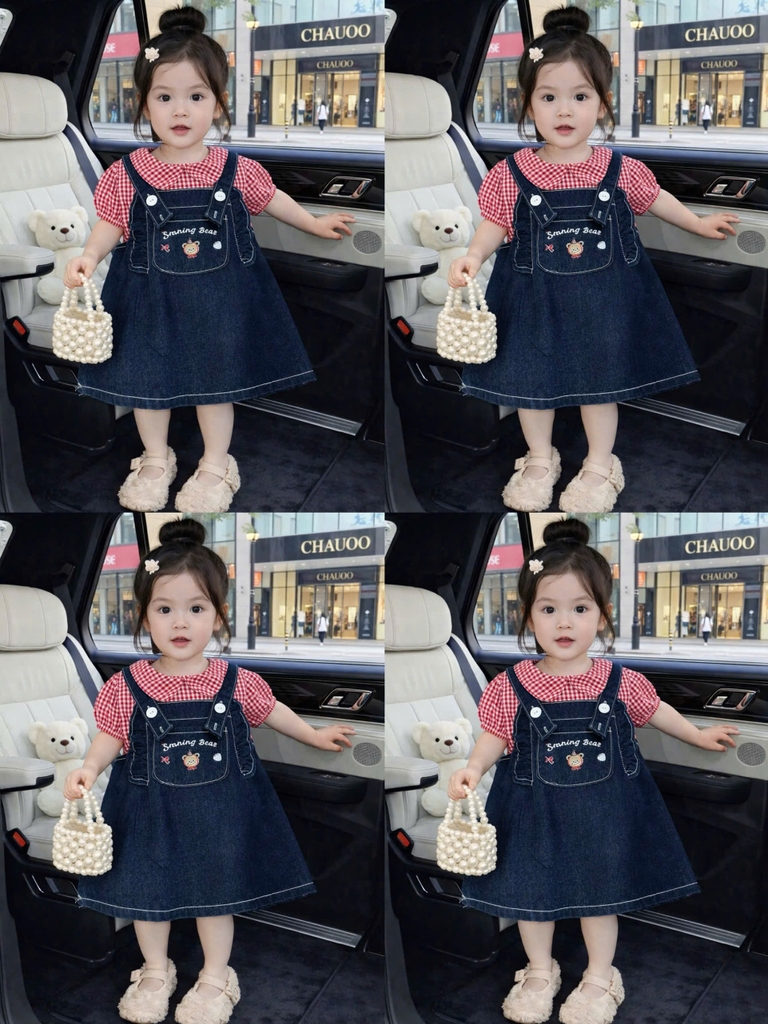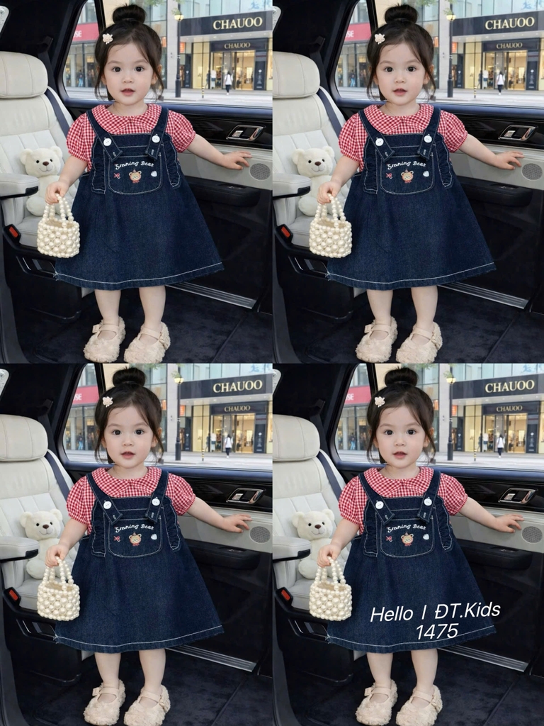 V379-Set áo caro đỏ váy yếm jean (10.20kg)